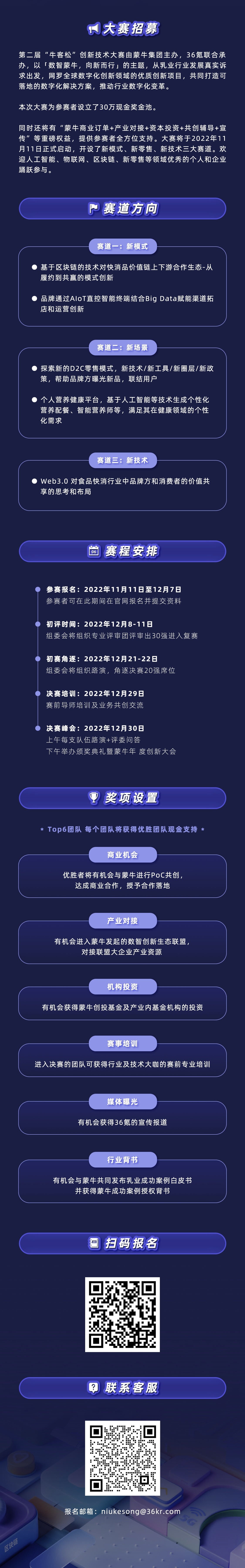 本次大赛由蒙牛集团主办、36氪联合承办,大赛将继续围绕“数智蒙牛·向新而行”的主题,与全球优秀创业者共同打造行业创新解决方案。第二届“牛客松”创新技术大赛还将着力打造蒙牛数字化创新联盟,聚焦全产业链数字化转型,持续打造消费品行业数字创新生态圈。