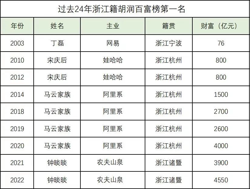 丁磊是首个问鼎中国首富的浙商,马云4次登顶,娃哈哈创始人的宗庆后、钟睒睒也都2次登顶。