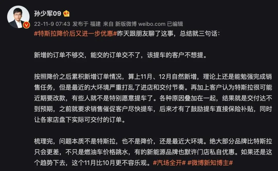 在特斯拉公布新一轮的保险优惠措施后,关注汽车一线销售的自媒体车 fans 负责人 @ 孙少军 09 在微博上面用了三句话点评: