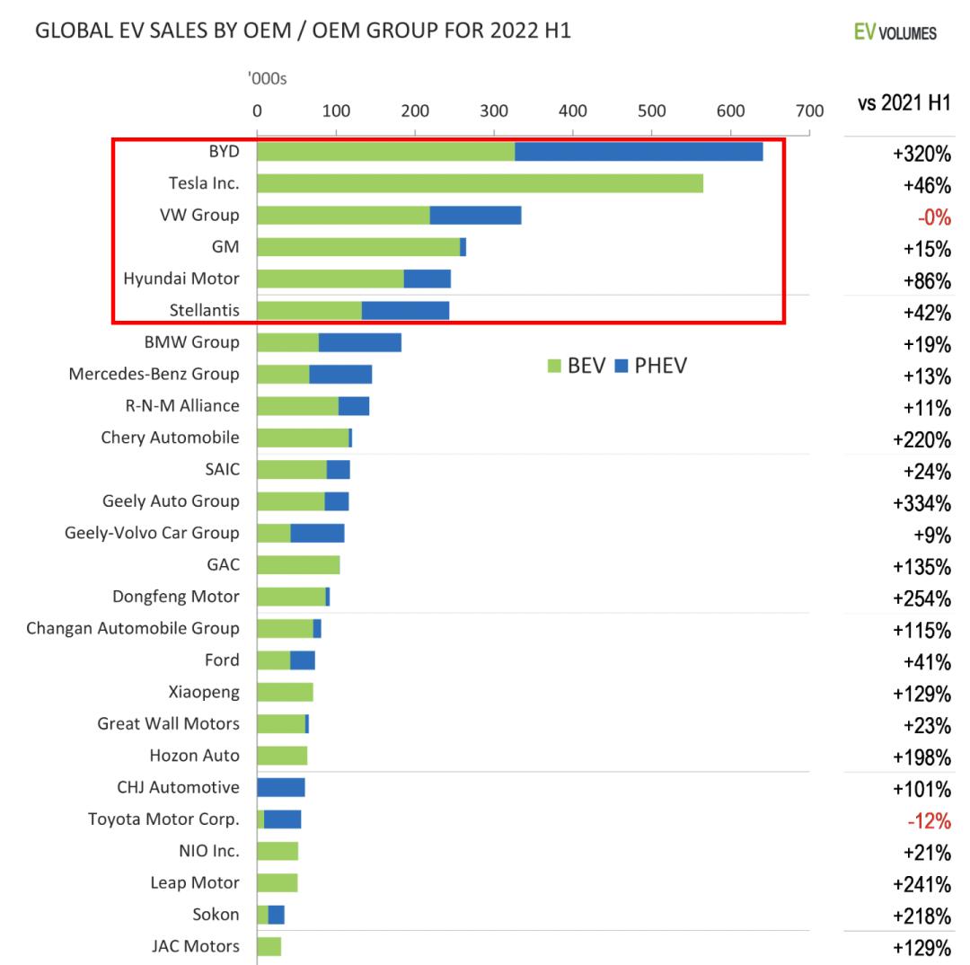 设立这样一道门槛后,放眼全球,能达到要求的车企两个手都数得过来,今年上半年,新能源车销量超过20万辆的车企仅有比亚迪、特斯拉、大众、通用、现代和Stellantis。