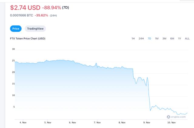 在这几天里,SBF最强对手赵长鹏一度成为了他唯一的救命稻草,表示愿意解救FTX,但不久便收回了收购意愿。在这场大战中,SBF惨败,截至11月10日16:00,FTT在过去的48小时内,下跌近90%,至2.74美元,同时媒体称知情人士透露,SBF已经告诉FTX的客户,如果没有人愿意收购,公司就需要申请破产。