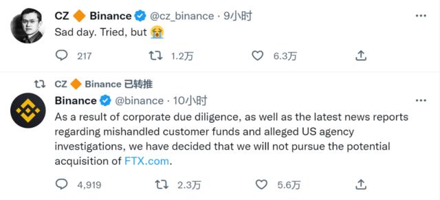 11月9日,Coindesk援引知情者的消息称,币安很可能不会再推进收购FTX的计划。在评估FTX内部数据及贷款承诺后,币安就发现了问题,开始反对完成收购交易。