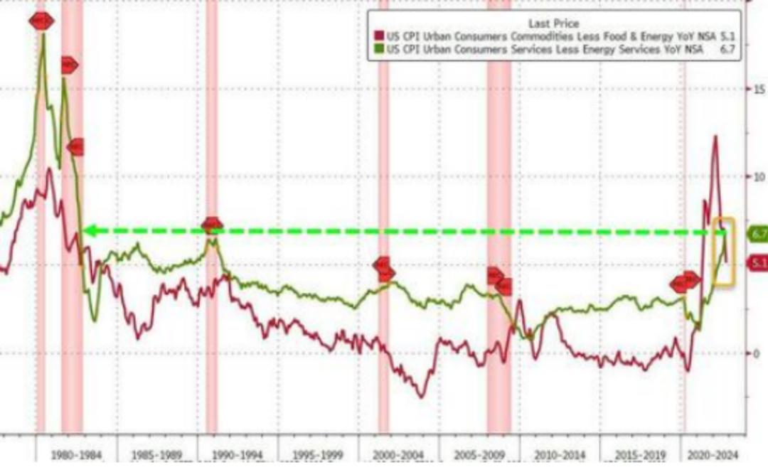 核心服务通胀目前处于1982 年以来的最高水平,涨幅超过商品通胀;环比来看,核心商品成本下降,服务与食品成本通胀上扬。