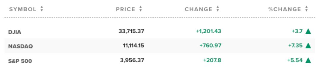 截至收盘,道指涨3.70%,标普500指数涨5.54%,纳指更是涨7.35%并创下2020年3月以来最大单日涨幅。周四席卷美股市场的兴奋情绪在历史上有充分的理由:每当通胀见顶时,两位数的涨幅就会随之而来。
