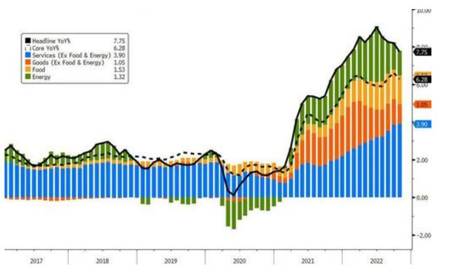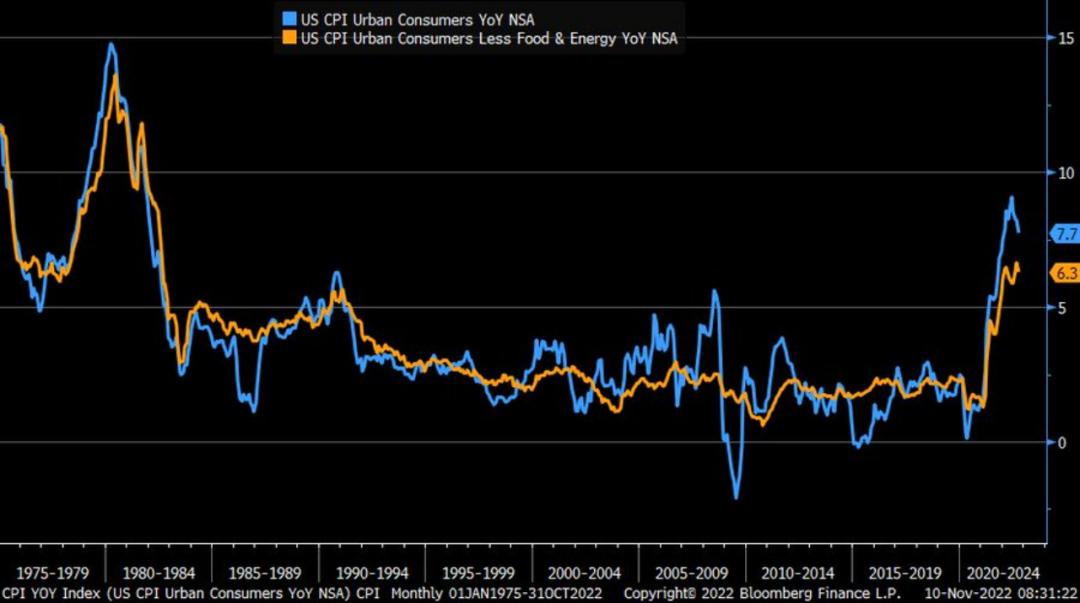 数据显示美国10月CPI同比上涨7.7%,显著低于9月的8.2%以及市场预期的8%。值得一提的是,7.7%同比增幅意味着该数据时隔七个月首次回到8%下方,这也是俄乌冲突爆发以来的低位。环比上涨0.4%,同样好于市场预期的0.6%,增速与前值0.4%一致。