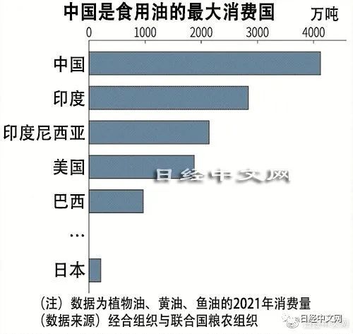 中国是世界上最大的食用油消费国。据来自经济合作与发展组织(OECD)和联合国粮农组织(FAO)的数据,中国的食用油(植物油、黄油、鱼油)的消费量在2021年达到4123万吨,占到全世界的约2成。人均年消费量也达到28kg,比总消费量排在第二的印度多4成左右。当然,废油的排放量也遥遥领先。