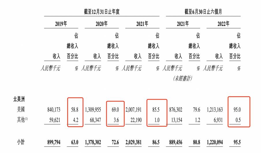 其次是区域依赖症。虽然子不语称产品销售全球超过80%的国家及地区的终端客户,但主要还是在欧美市场。截止2022上半年,子不语在北美洲的收入占总收入的95.5%,其中美国占据95%;来自欧洲的收入占总收入的3.6%;而来自亚洲的仅有0.3%。
