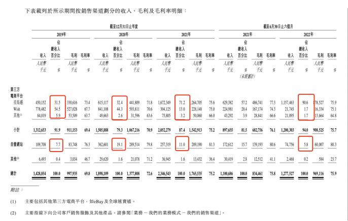 首先是严重的亚马逊依赖症。子不语的销售渠道主要分为第三方电商平台和自营网站。招股书显示,2019年~2021年,子不语来自第三方电商平台的收入分别占比91.9%、79.3%、87.4%,2022年上半年进一步增长至94.0%。