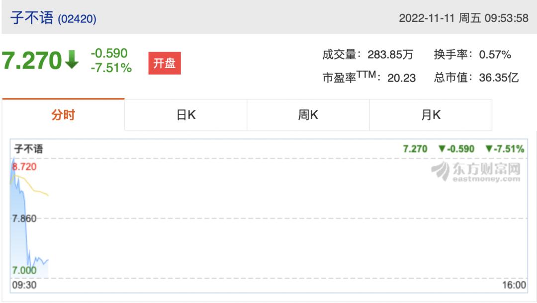 11月11日,跨境电商企业子不语正式登陆港交所,股票代码为02420.HK,开盘涨7.51%,报8.57港元每股,随后高开低走,现报7.27港元每股,低于发行价7.86港元,总市值36.35亿港元。