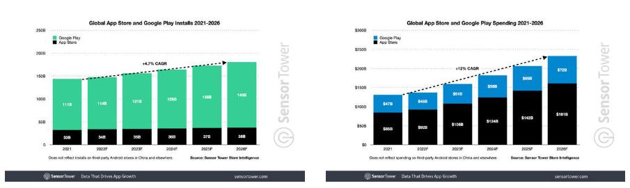 (苹果、谷歌应用商店下载量、收入情况 图源:Sensor Tower)