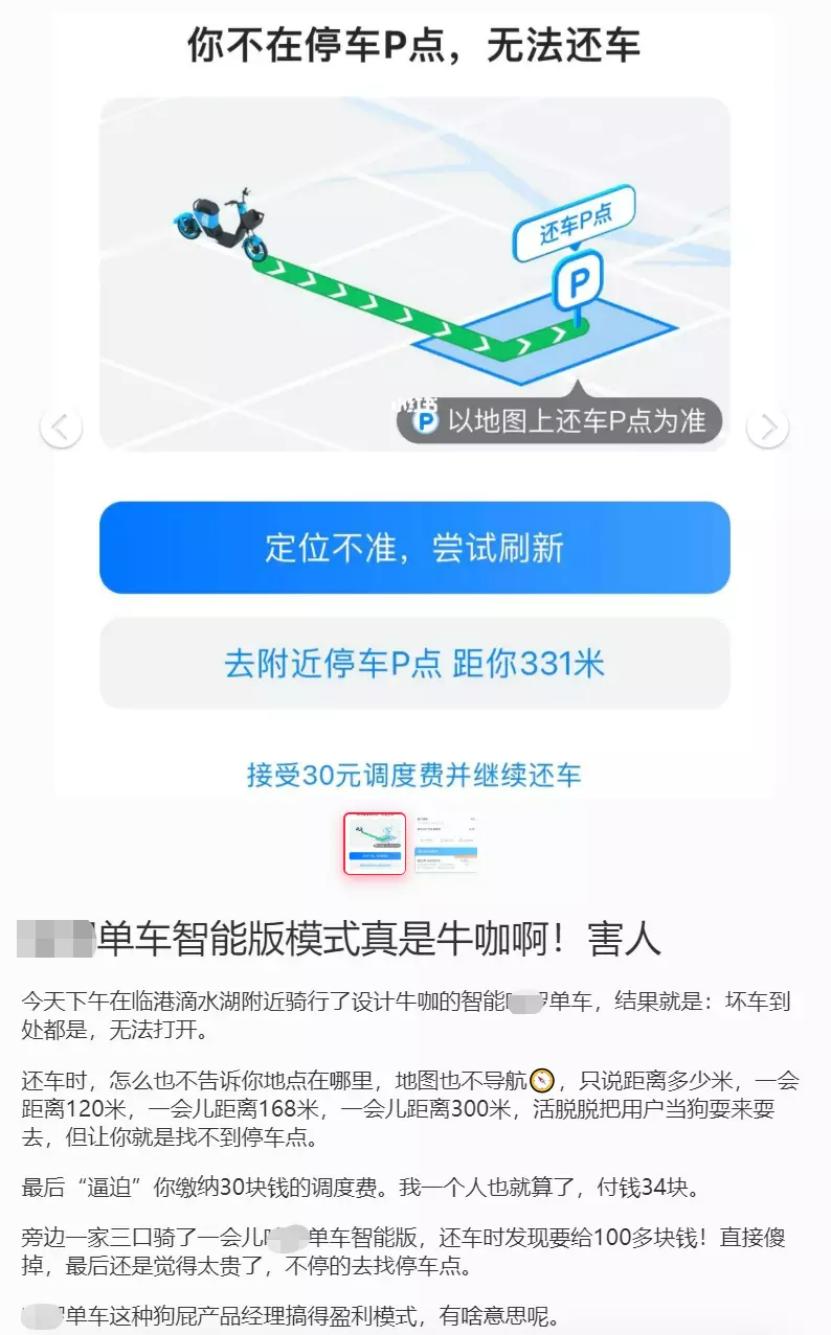 社交平台上一篇坐标上海的笔记显示,“还车时不告诉地址在哪里,地图也不导航,只说距离多少米,一会距离120米,一会儿距离300米,但你就是找不到停车点。最后‘逼迫’你缴纳30块钱的调度费。”在这篇笔记中,还有一家三口还车时发现要给100多元调度费的情况。