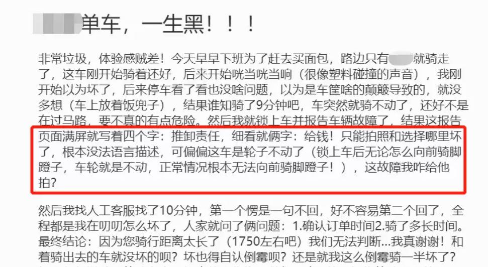 “报修是用户的义务不是责任,平台要求客户必须拍照上传,占用了客户太多时间;其次,平台设计的不合理性也加大了用户报修的难度,难怪某单车的故障率能排到第一。”空空表示。