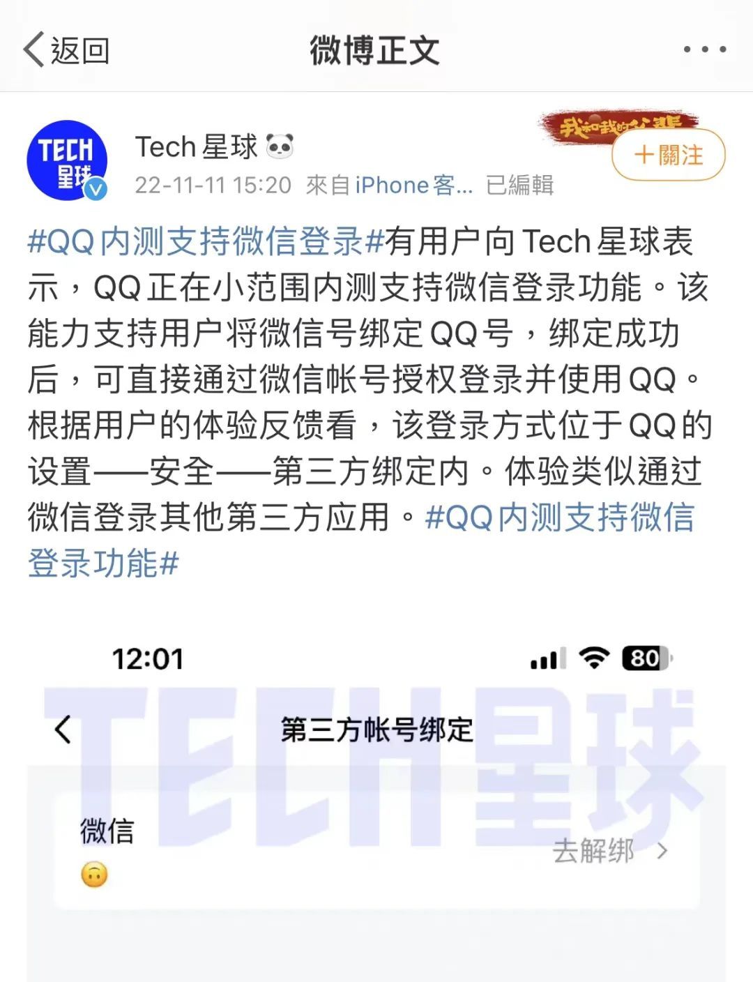 11月11日,据“Tech星球”爆料,QQ正在小范围内测支持微信账号登录的功能,用户选择绑定微信账号后可直接发起登录。据悉,QQ目前仅有约6亿活跃用户,而微信有12.99亿。