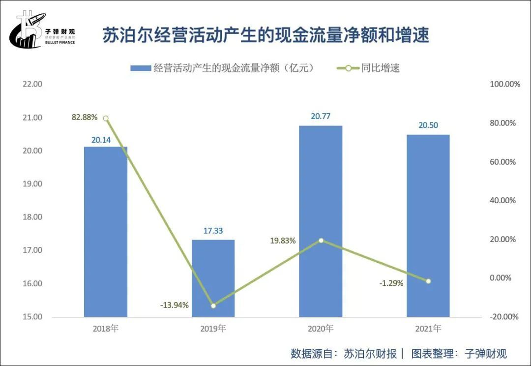 同时,苏泊尔经营活动产生的现金流量净额增速同样呈总体趋缓的态势。根据苏泊尔往期财报,该公司经营活动产生的现金流量净额增速已由2018年的82.88%降至2021年的负数,为-1.29%。