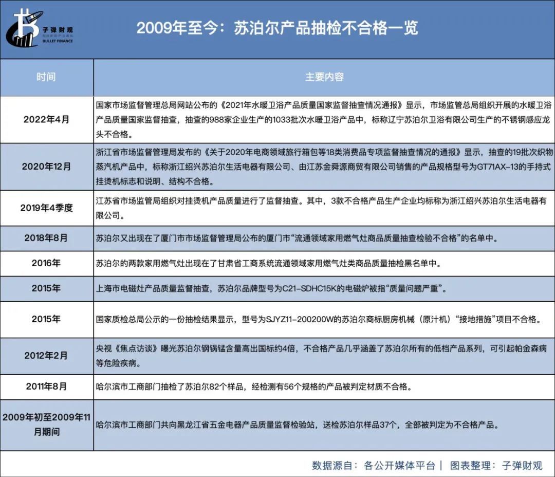 而苏泊尔的“质量门”并非偶发事件。据「子弹财观」不完全统计,自2009年以来,苏泊尔被抽检产品累积不合格次数至少达10次。