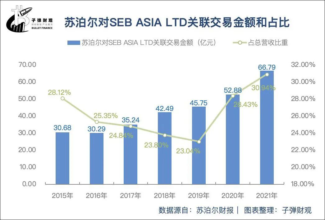 苏泊尔披露的财报数据显示,从2015年到2021年,苏泊尔对SEB ASIA LTD关联交易金额分别为30.68亿元、30.29亿元、35.24亿元、42.49亿元、45.75亿元、52.88亿元和66.79亿元;占其当期总营收的比重分别为28.12%、25.35%、24.84%、23.80%、23.04%、28.43%和30.94%。