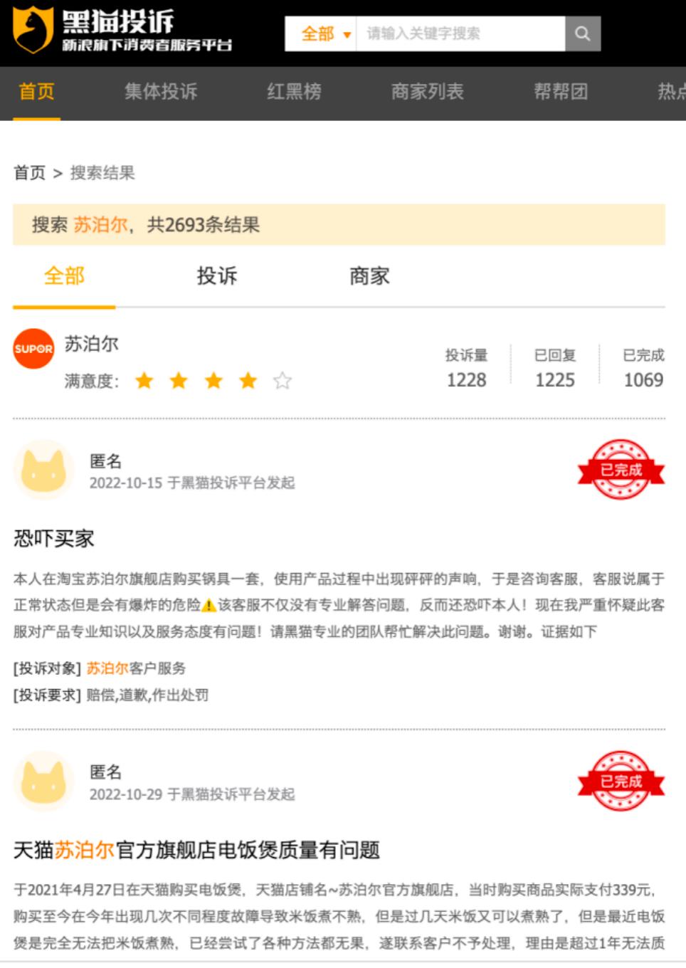 此外,苏泊尔也面临口碑下滑的尴尬境地。「子弹财观」注意到,在黑猫投诉平台上,涉及苏泊尔的投诉合计高达1228条,而网友们对苏泊尔的投诉主要为产品质量差、售后服务差、虚假宣传、不发货与不退款等。
