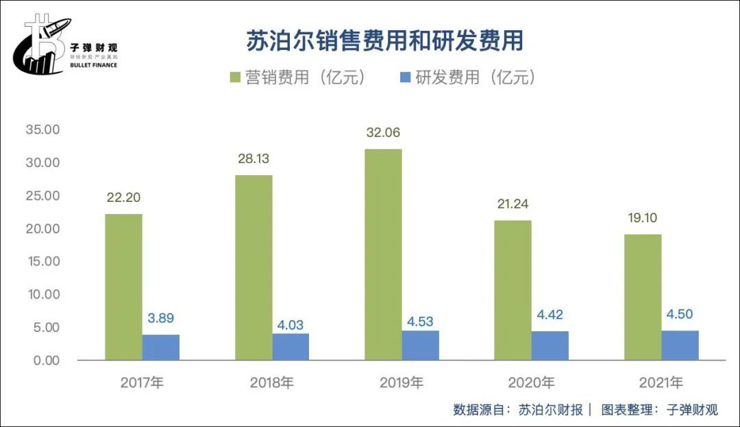 苏泊尔正面临“重营销、轻研发”的市场质疑。根据财报数据,从2017到2021年,苏泊尔的销售费用分别高达22.20亿元、28.13亿元、32.06亿元、21.24亿元和19.10亿元,占总营收比例分别为15.60%、15.76%、16.15%、11.42%和8.85%。