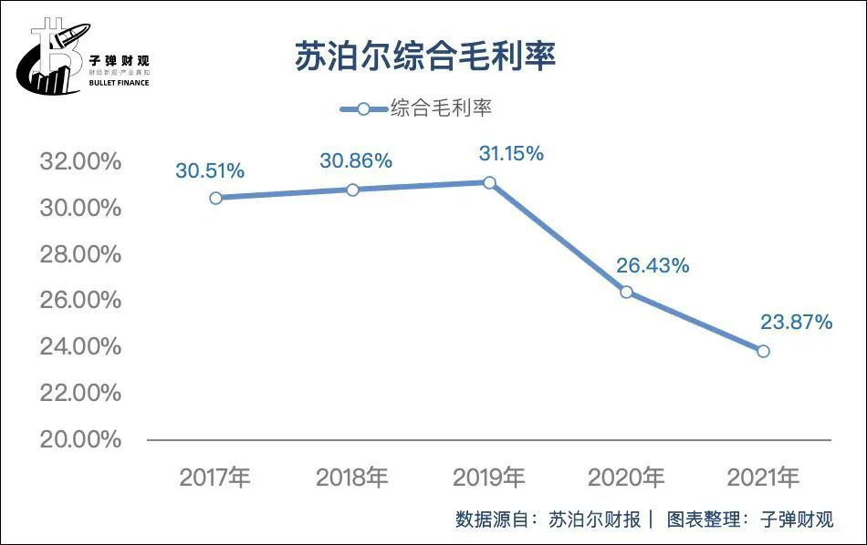 除此之外,苏泊尔的综合毛利率整体呈波动下滑趋势。苏泊尔披露的财报信息显示,过去5年,该公司的综合毛利率已从2017年的30.51%降至2021年的23.87%。