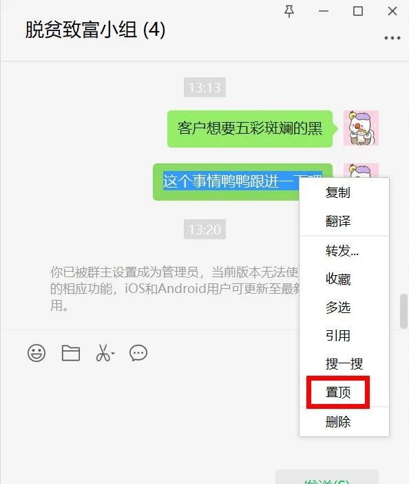这个功能之前手机版也已经有了,置顶之后,该消息会出现在群聊的顶部️,所有群成员都能看到。