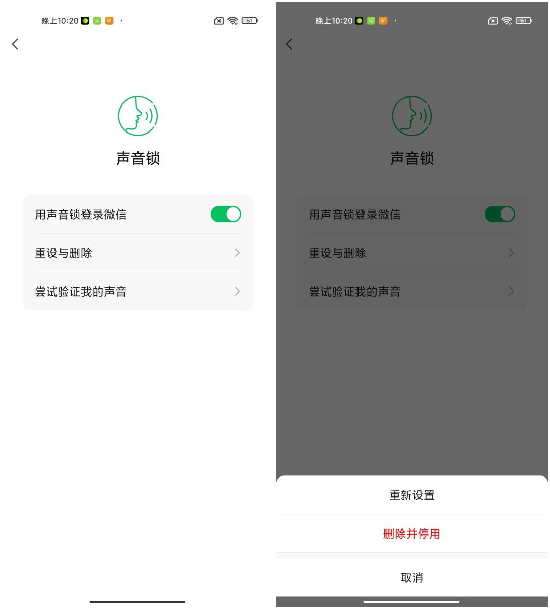 在微信的【设置】-【账号与安全】-【声音锁】页面,新增了【重设与删除】选项。可以【重新设置」或【删除并停用】声音锁。