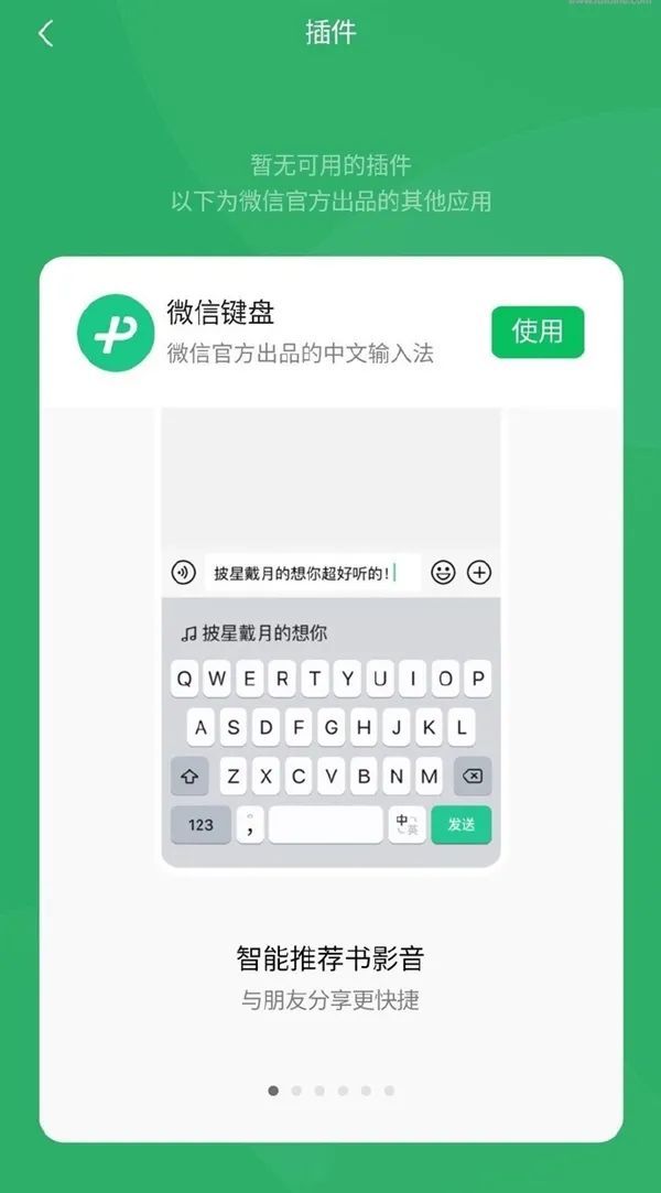 有用户表示在最新版微信的【插件】页面中,微信已开始向用户推荐自己的输入法“微信键盘”。