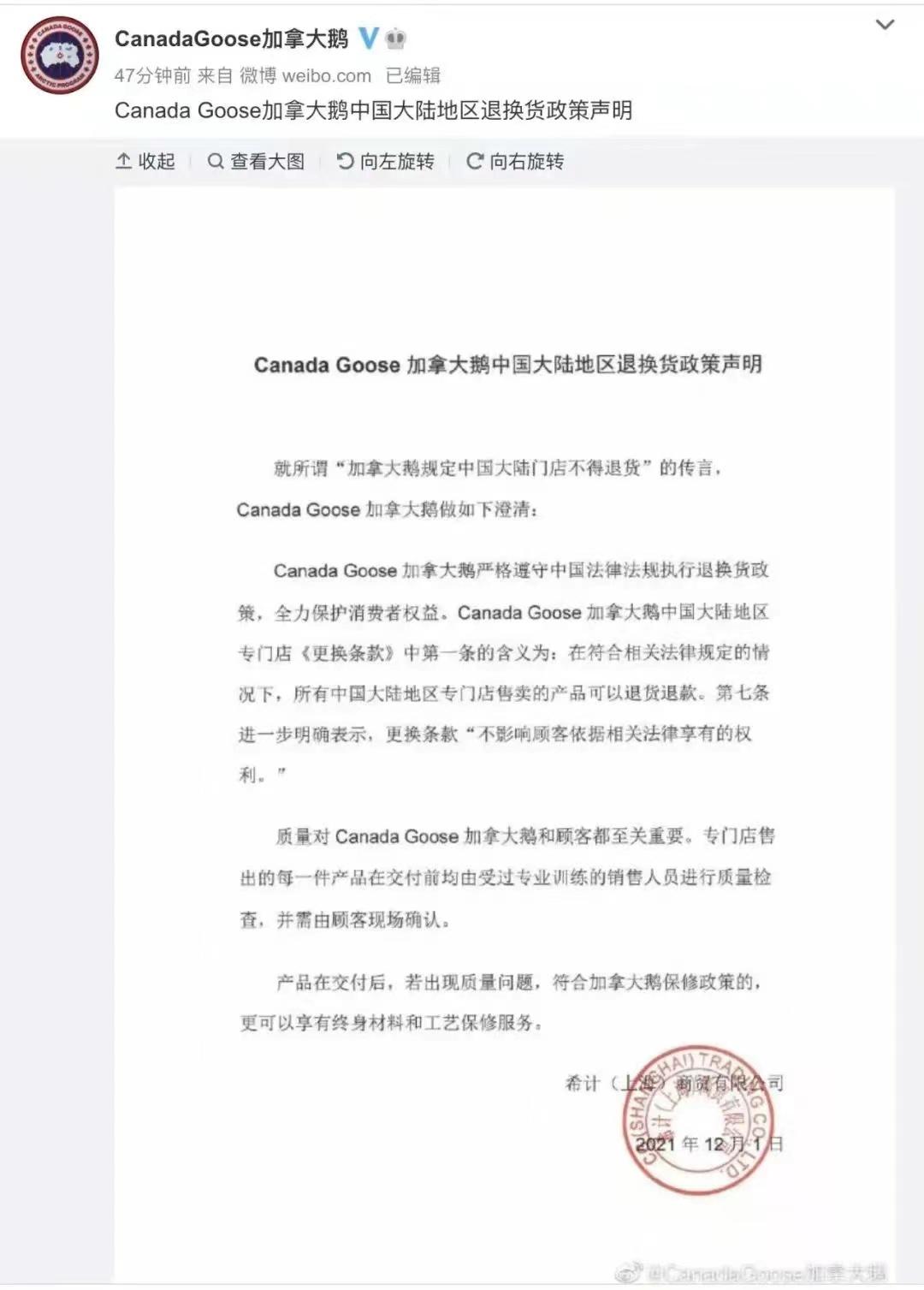 最终迫于多方压力下,加拿大鹅改口称在符合相关法律规定的情况下,所有中国大陆地区专门店售卖的产品可以退货退款,但国内消费者对加拿大鹅的好感度一落千丈。负面事件发酵后,加拿大鹅市值更是10天蒸发84亿。