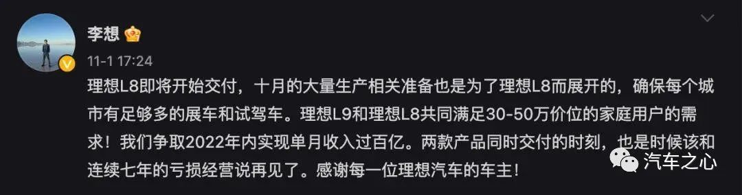 「理想 L9 和理想 L8 共同满足 30-50 万价位的家庭用户的需求,我们争取 2022 年内实现单月收入过百亿,两款产品同时交付的时刻,也是时候该和连续七年的亏损经营说再见了。」