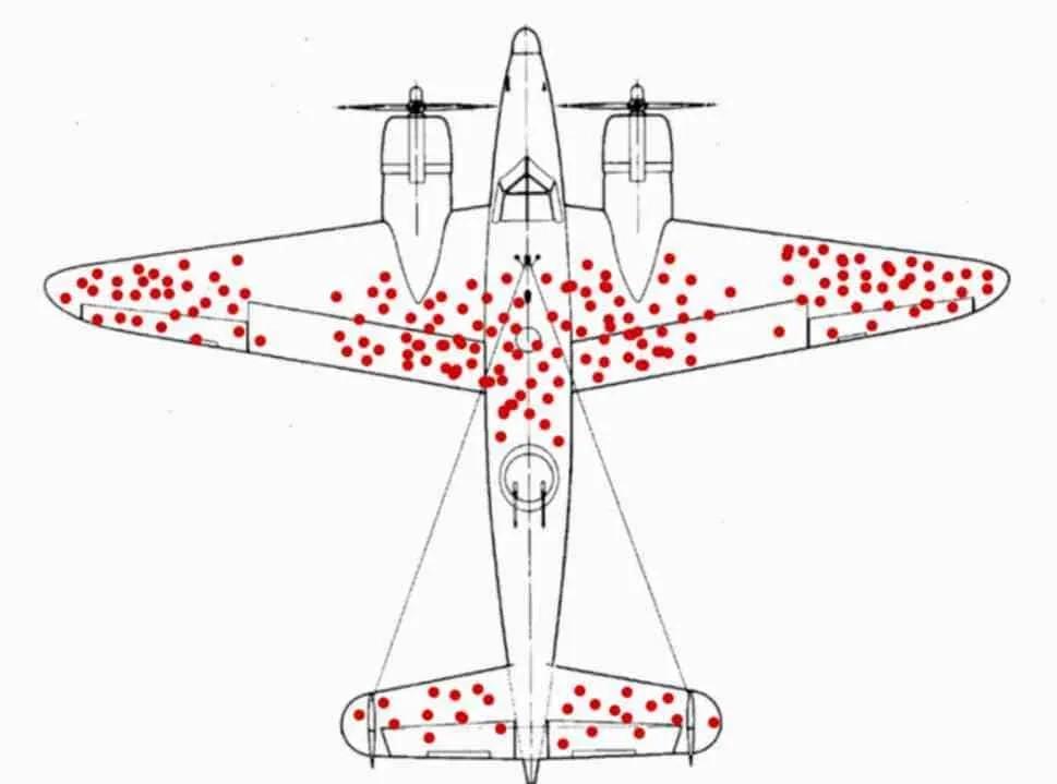 生存者偏差的一个著名例子来自二战。美国希望在飞机的特定部位增加强化装甲。分析人员绘制了返航轰炸机上的弹孔和损伤情况,认为需要对机尾、机身和机翼进行加固。但一位名叫亚伯拉罕·沃尔德的年轻统计学家指出,这是错误的。分析人员只绘制了返航飞机的数据,却没有关注那些受损且无法返航的飞机。