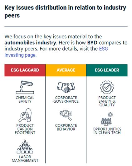 以比亚迪的评级为例。自2017年以来,MSCI对比亚迪的ESG评级一直是A级。MSCI认为,在关键议题方面,比亚迪在“产品安全与质量”、“清洁技术机遇”方面,处于行业领先。但在“化学安全”和“劳工管理”、“产品碳足迹”三个议题上处于落后水平。
