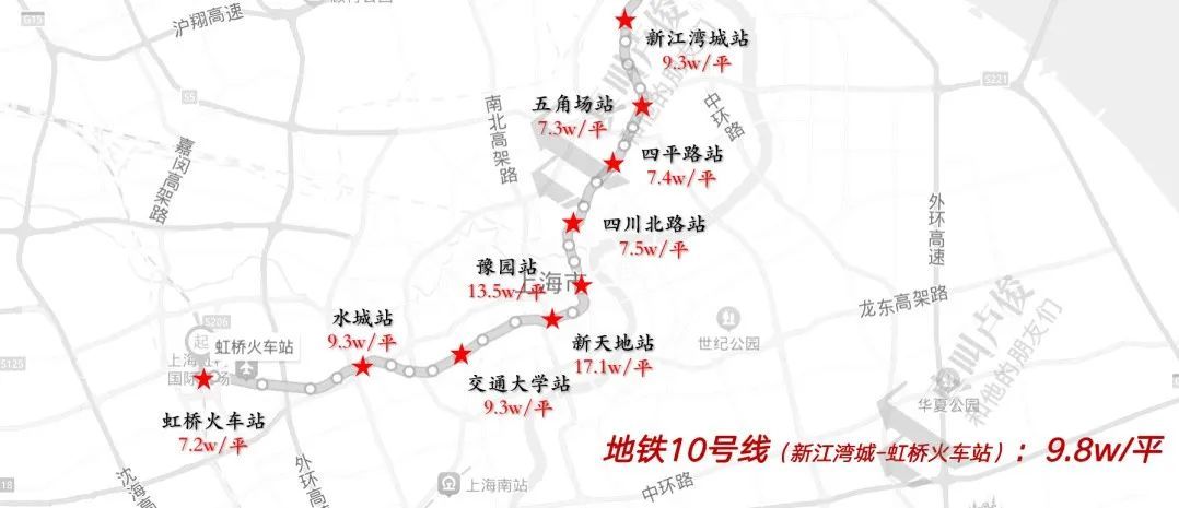 由此可得,中山公园站为10.2w/平,其他站点以此类推。
