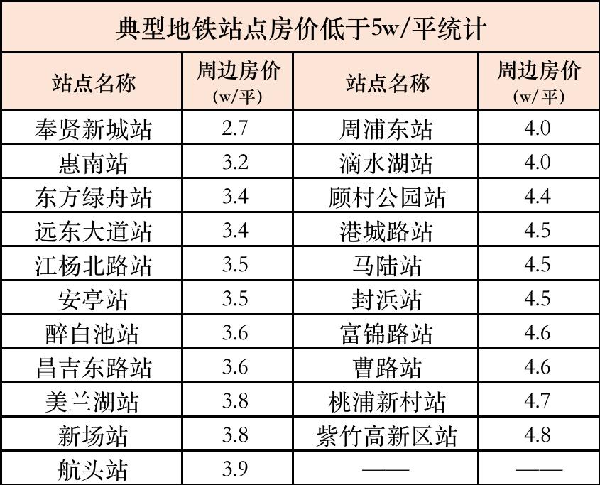 最低房价地铁站点:奉贤新城站(2.7w/平)。