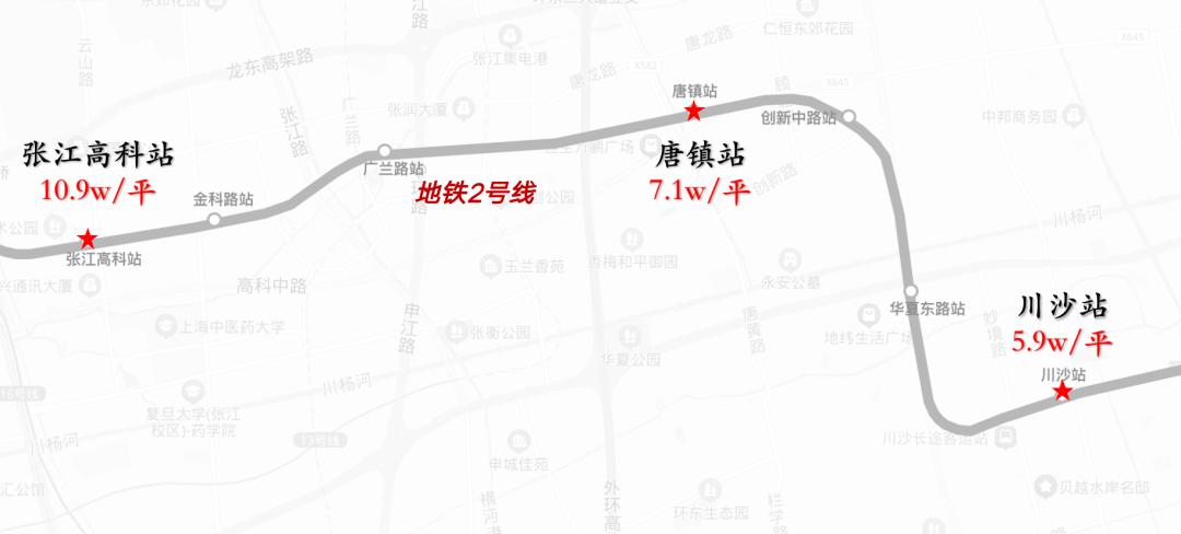如2号线的张江高科站,单价在10.9w/平,附近唐镇站也去到了7.1w/平,哪怕再往后走的川沙站房价也有5.9w/平。