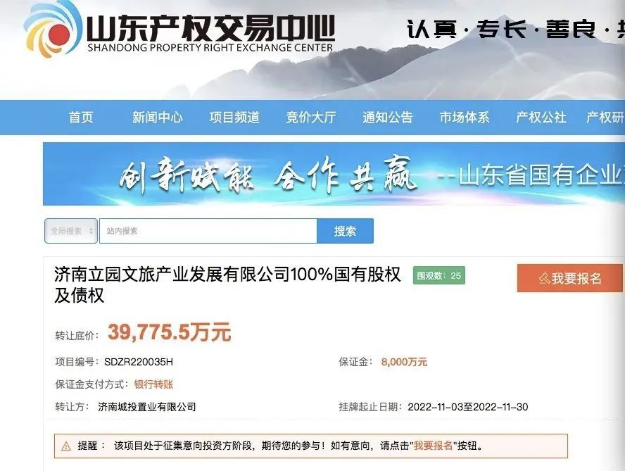 上周,济南城投置业有限公司将旗下的济南立园文旅产业发展有限公司100%国有股权及债权在山东产权交易中心挂牌,转让底价3.98亿元,挂牌起止日期2022年11月3日至2022年11月30日。