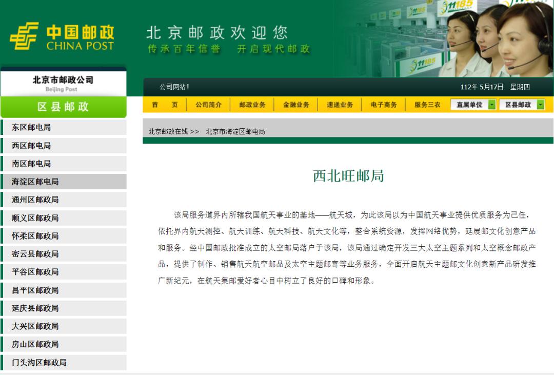 太空邮局的经营模式还有点特别,分为了两块。一块是实体邮局,它开在海淀区西北旺镇的北京航天城西北旺邮局里。