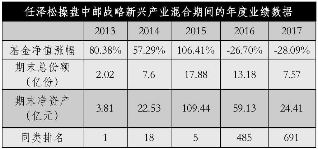 2013年,任泽松操盘中邮战略新兴产业混合,重仓旋极信息、尔康制药、海峡创新等小盘股,年底收益率达到80.38%,大幅跑赢同类基金(平均涨幅16.33%),登顶成为年度冠军。