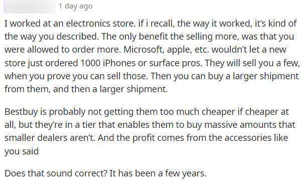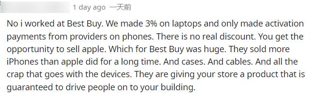 也有在百思买干活的网友,表示卖苹果利润特别少,之所以还要卖,是因为商店里有苹果产品能增加吸引力,顾客来了以后会消费其他东西。
