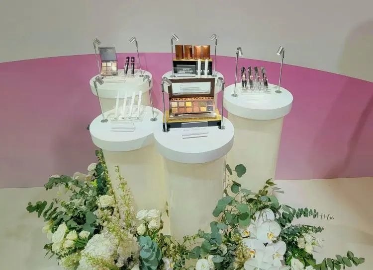 粉饼、眼影、唇釉等彩妆类品牌零星放置在几个展示台上。 /新周刊记者 摄