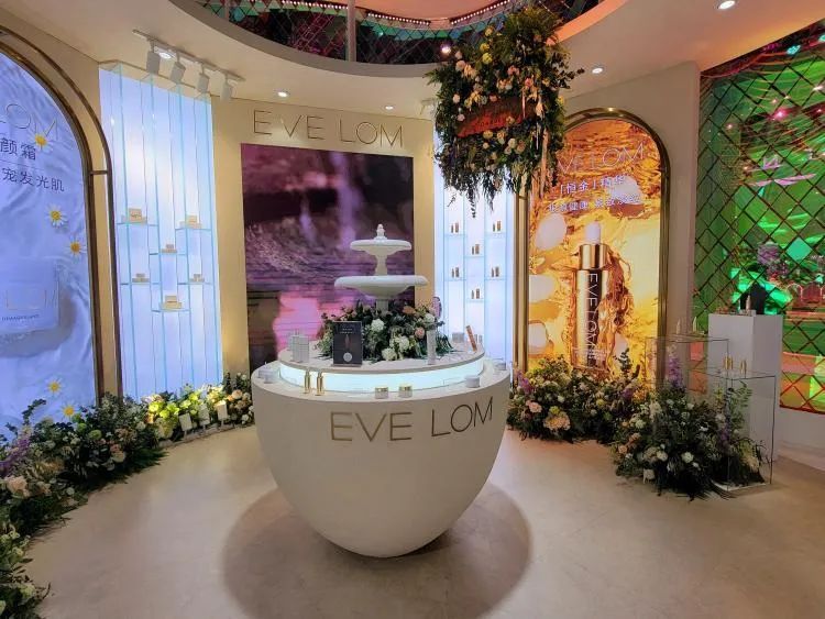 展区内,花团锦簇下的EVE LOM 展台。/新周刊记者 摄