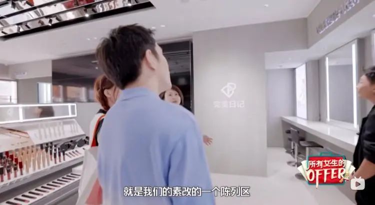 以完美日记参与的第一季的第二期为例,在谈判之前,完美日记方介绍了他们在办公区布置的1:1还原线下门店的陈列区,并毫不生硬地向观众传达出“完美日记线下门店设立‘素改区’”的信息点。