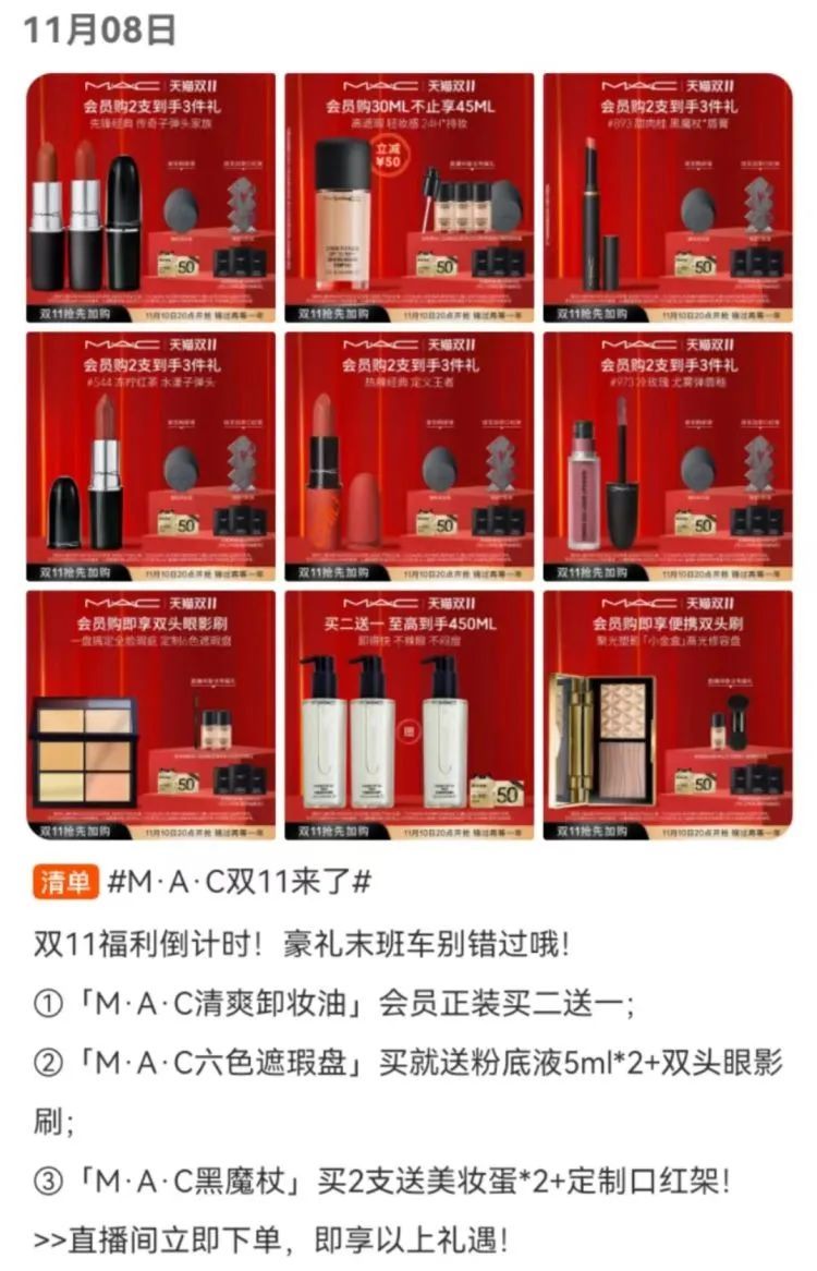 对比今年彩妆品类预售第一名的MAC,完美日记备战双十一的动作,确实谈不上积极。早在10月11日,MAC便在其官方旗舰店内为双十一做预热准备。往后的一个月,几乎每日一次的频率推广“MAC 必囤清单”“MAC 双11来了”等话题,并附带上双十一产品清单。