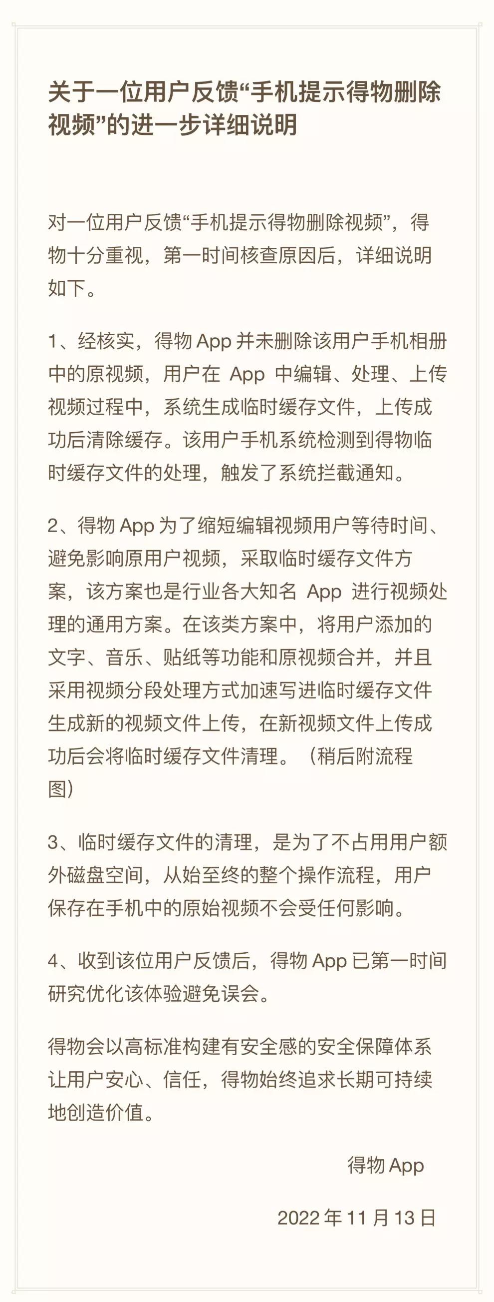 得物表示,经核实,得物 APP 并未删除该用户手机相册中的原视频,用户在 App 中编辑、处理、上传视频过程中,系统生成临时缓存文件,上传成功后清除缓存。该用户手机系统检测到得物临时缓存文件的处理,触发了系统拦截通知。