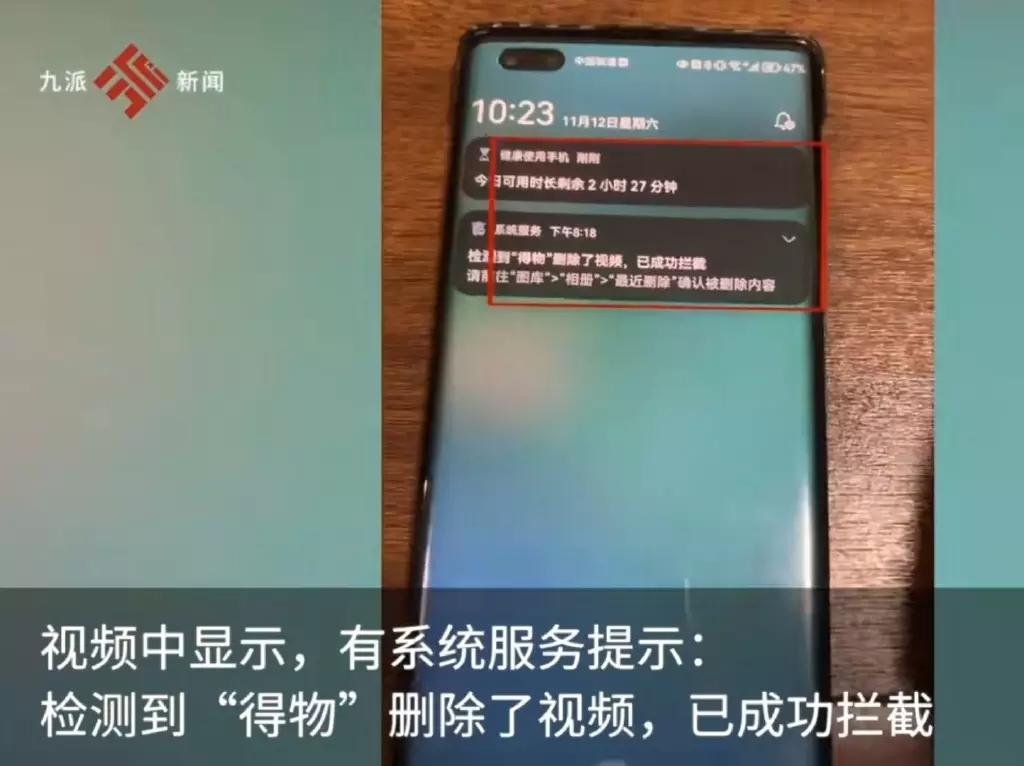 11月12日,网友曝光表示,“双十一”期间在购物软件得物上买的东西出现了问题,便拍摄了视频上传平台反馈,随后,他的华为手机收到了提醒“得物调用手机权限删除投诉视频”。