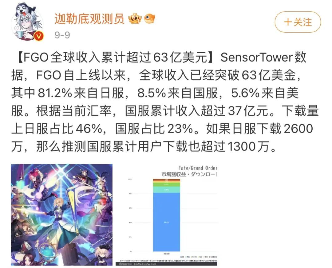 一个季度近7亿的收入,几乎全部来自于二次元游戏《FGO》。这一数据已经相当炸裂,仅以去年腾讯游戏推出的王牌项目《英雄联盟手游》做对比,据七麦数据显示,后者近3个月的收入在iphone端的收入约为6000万美元。由此可见,B站当时靠《FGO》取得的收入颇为丰厚。