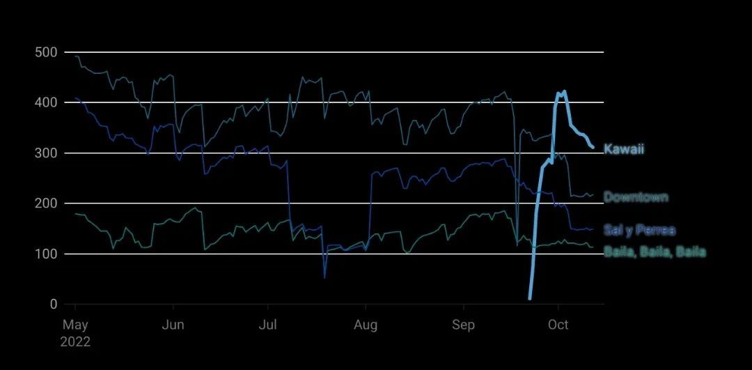 数据对比显示,YouTuber“MarinoSaurio”在9月18日发布一段该歌曲作为配乐的动漫角色视频,在4天之内获得了超过30万的播放量,另一支加入角色舞蹈动作搭配该歌曲的视频则获得了超2100万的播放量。同样的,《Yonaguni》至今仍是Bad Bunny在Spotify上播放量最多的歌曲,《KAWAII》也被公认为是J Balvin迄今为止品质最强的合作曲,流行度远超其他。