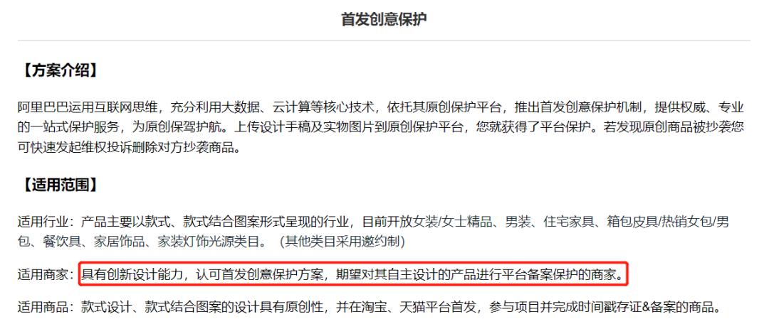 目前,阿里已经设立了阿里巴巴原创保护平台,在首发创意保护方面,平台规定,上传设计手稿及实物图片到原创保护平台,就可以获得平台保护,目前主要适用于产品主要以款式、款式结合图案形式呈现的行业。