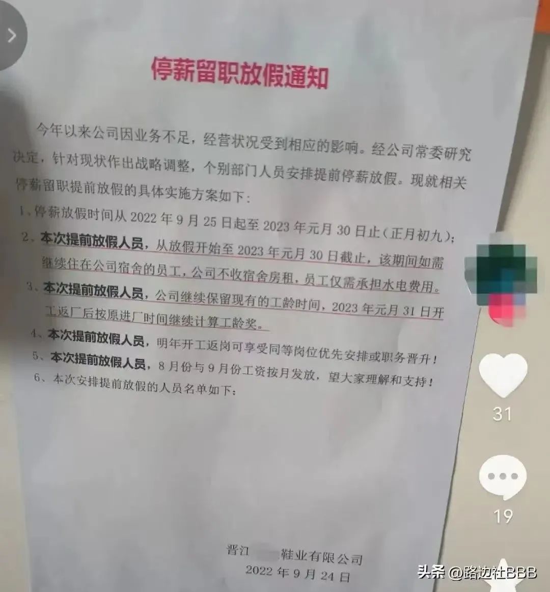 ▲晋江某鞋业有限公司的《停薪留职放假通知》。