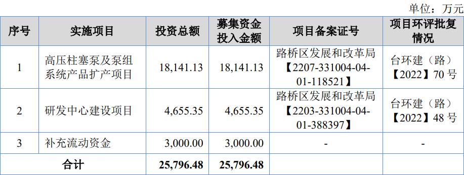 IPO募资方面,本次公司拟募资2.57亿元,资金将用于高压柱塞泵及泵组系统产品扩产项目、研发中心建设项目、补充流动资金等。项目顺利实施后,将显著提升公司主营产品生产线的生产效率,优化产品线结构,提升公司产能,进一步提升公司市场竞争力。