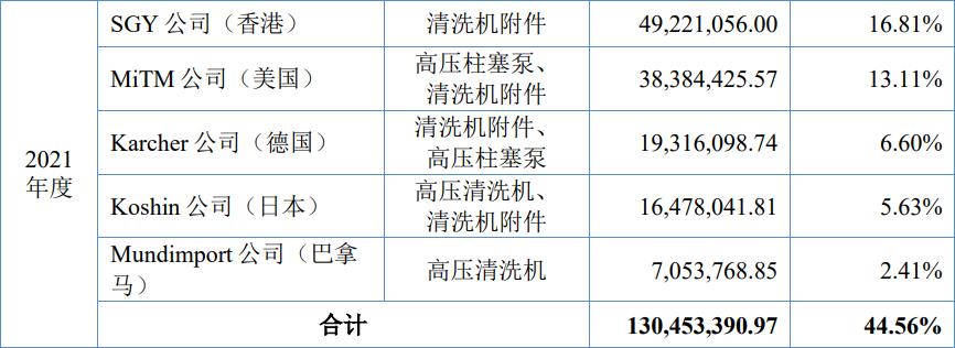客户方面,浙江大农客户主要是境外客户。2021年公司前五大客户分别是SGY公司(香港)、MiTM公司(美国)、Karcher公司(德国)、Koshin 公司(日本)、Mundimport公司(巴拿马)。