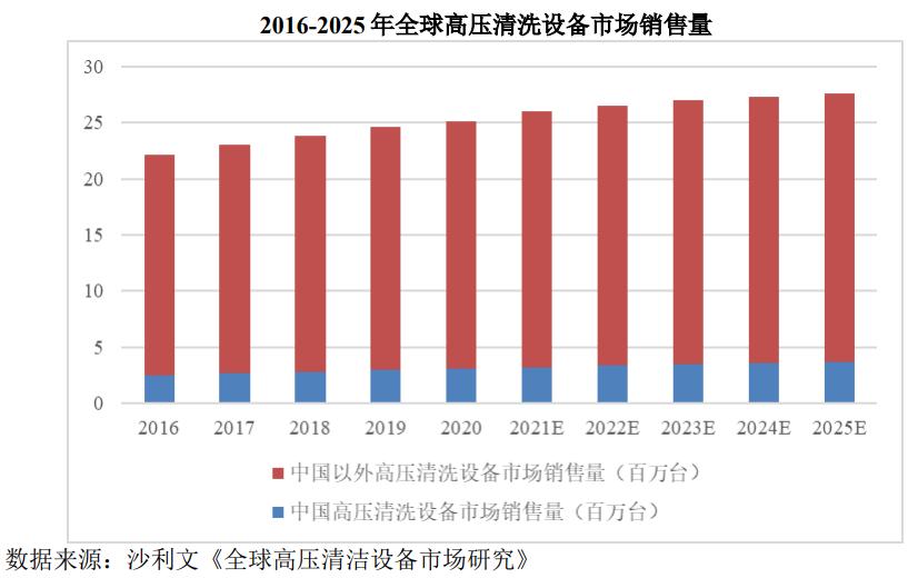 从全球销量来看,高压清洗在欧美日等发达国家经历了较长的发展时间,开拓了广泛的下游应用领域,整体市场较为成熟。全球范围内,高压清洁设备的市场销售量稳定增长。2020年,全球高压清洗设备销量约为2510万台,预计到 2025年,全球高压清洗设备的销售量将达到2760万台。